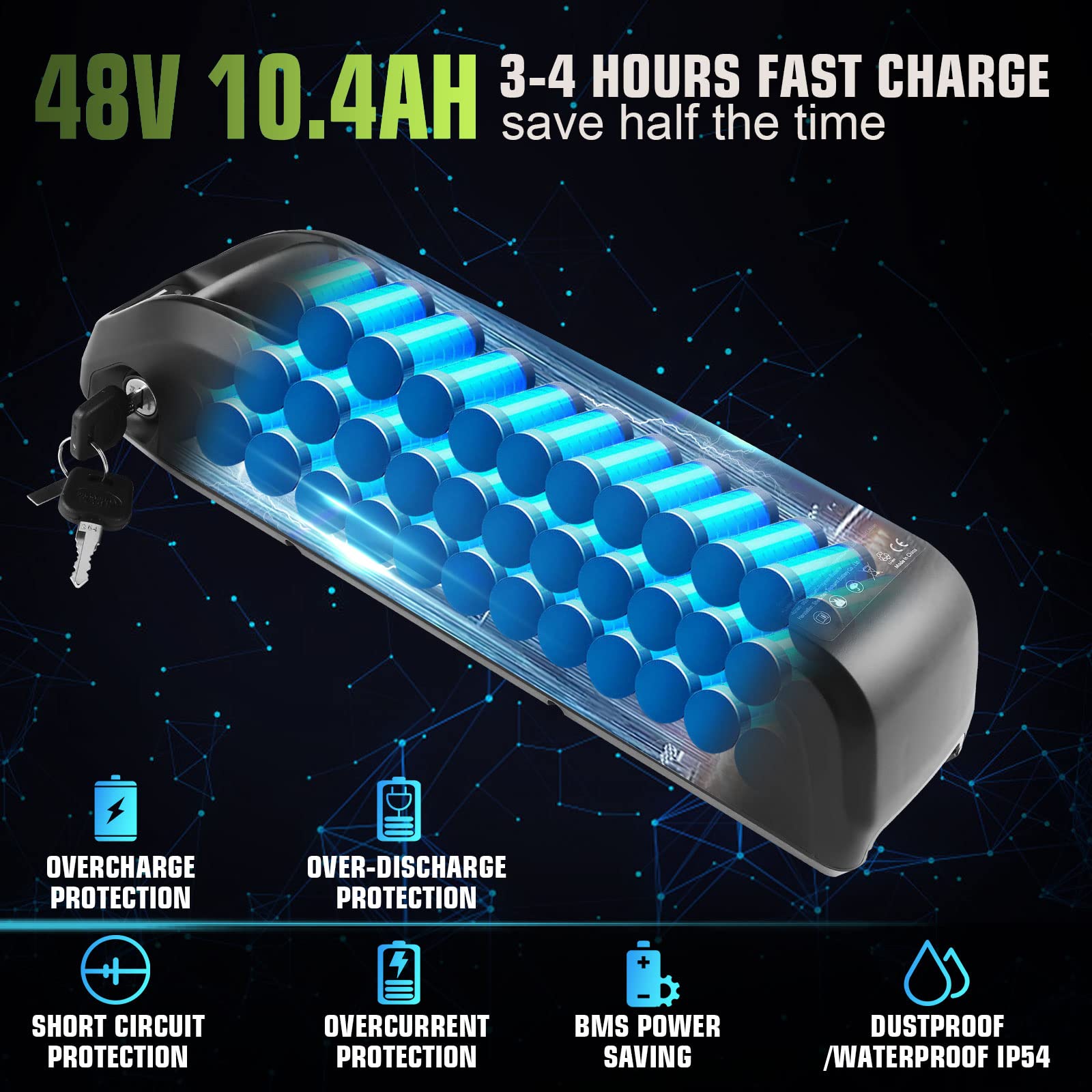 - ►499WH LARGER CAPACITY FAST CHARGE BATTERY--Up to 26 miles per charge with the powerful 48V 10.4Ah battery. Plenty for a day's adventure or most trips to work and back. The battery adopts the new fast charging technology and only costs you 3-4 hrs for a fully charge. It saves half of the charge time. You can charge on/off the ebike by your convenience. No worry for being stolen.
