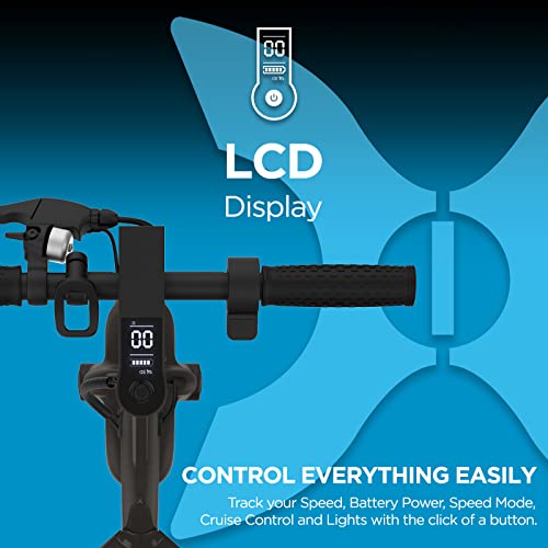Details: Zip-around in style with Hover-1 Alpha Electric Kick Scooter in a one-level foldable design. Featuring an electronic throttle, rear disc brake, 10" air-filled tires, and powerful 450W brushless motors that can reach a speed of 18 mph even on a 15-degree incline. Features an ultimate cruise control system for effortless long-distance commutes without any fatigue. LED headlight and deck light help improve visibility and LCD display keep track of both speed and power. This easy-to-ride electric scooter is perfect for kids, teens, and young adults as it provides complete stability and control for your outdoor adventures. Equipped with a 36V/6.0 Ah Lithium-ion rechargeable battery, this two-wheel scooter can travel up to 12 miles on a 5-hour charge. Meeting all necessary safety standards, it is UL2272 certified and MSDS & UN 38.3 tested. Whether you are a student, a tourist, or an office goer, buy one for yourself or gift it to your friends or family for Christmas or Birthdays. We encourage all riders to wear proper safety gear to protect themselves. Visit the Hover-1 Brand Store (click on our brand) to find helmets, knee & elbow pads, and get ready to hit the town.